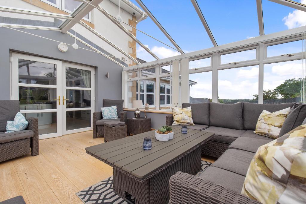 At the heart of the home is a bespoke breakfasting kitchen, a true showpiece with luxury units, integrated appliances, and a central island. This space flows seamlessly into a breakfast area and opens to the rear gardens, creating a perfect environment for family life and entertaining. Adjacent to the kitchen is a large Cinema/TV room, equipped with a full Bose surround sound system, and a conservatory bathed in natural light—ideal for relaxation or hosting guests.