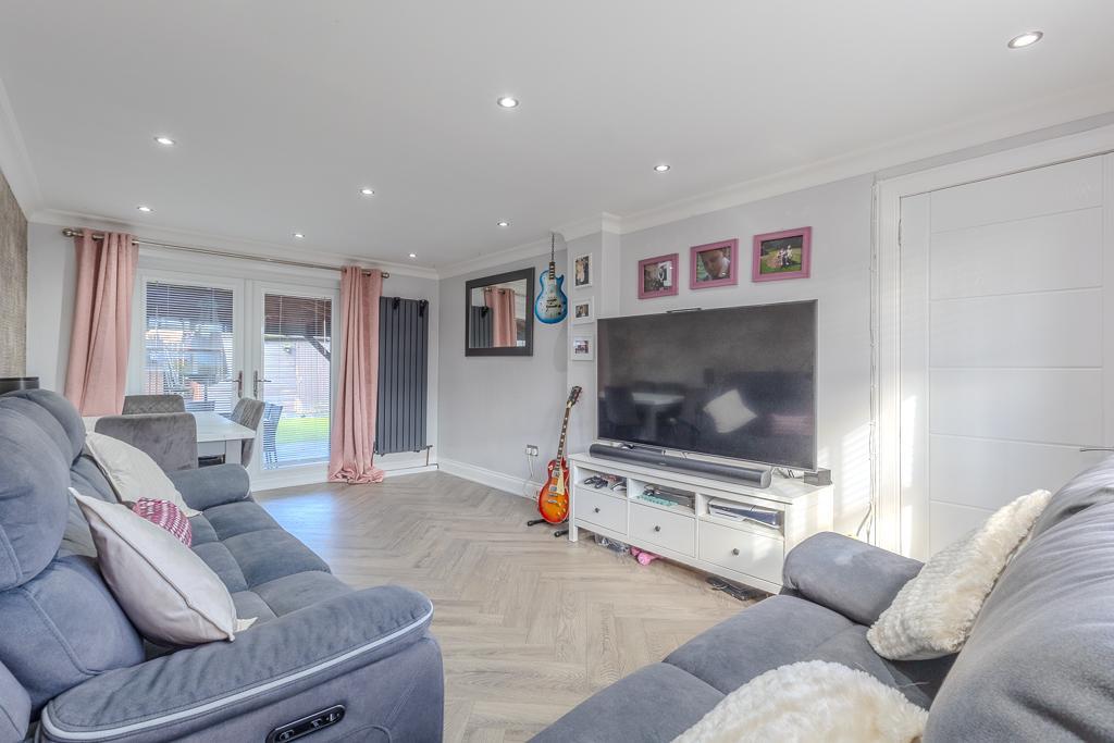 The property is entered via a welcoming entrance foyer which leads through to a bright and spacious dual-aspect lounge. This attractive living space benefits from excellent natural light through windows to the front and French doors to the rear, creating a warm and inviting setting ideal for both everyday living and entertaining.