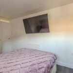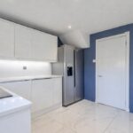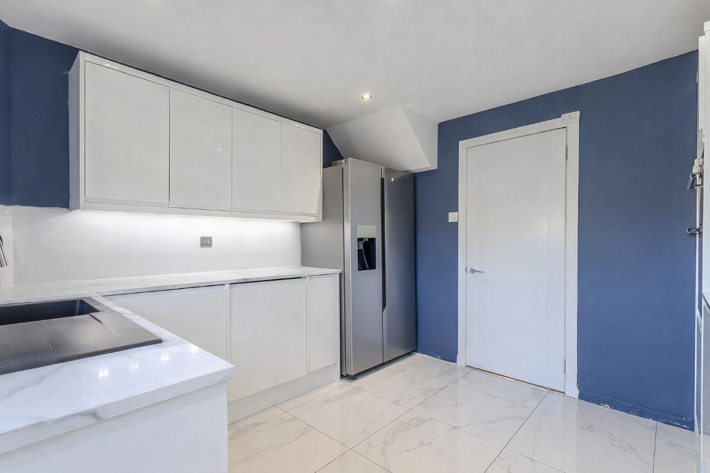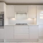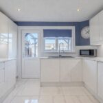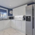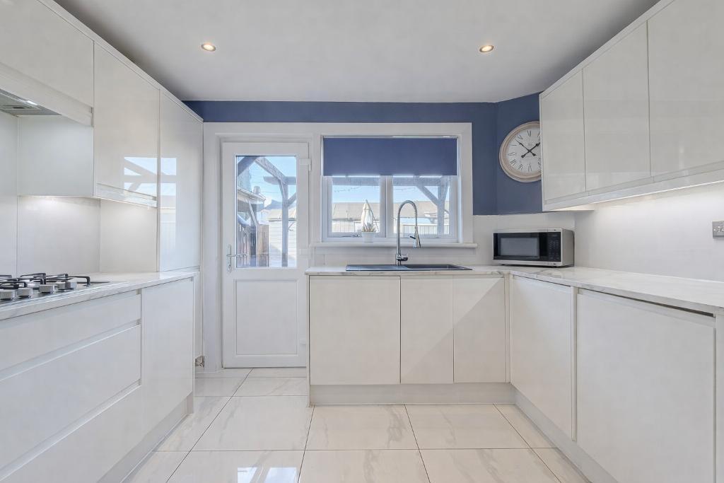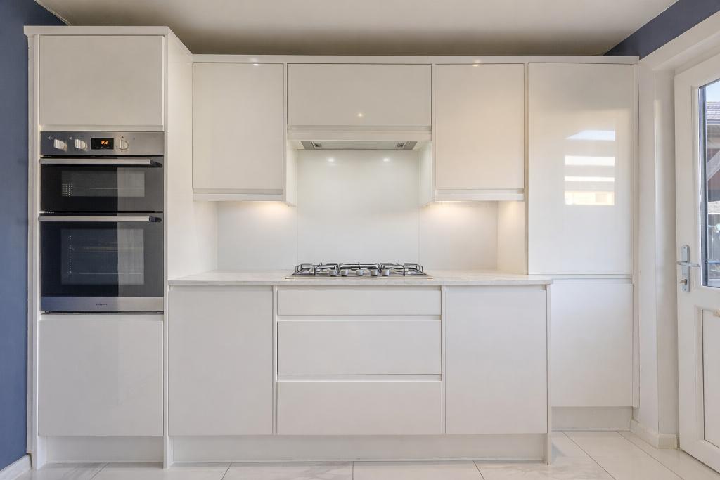 The modern fitted kitchen is finished in sleek high-gloss units and provides excellent storage and workspace, complemented by a range of integrated appliances which enhance both the practicality and contemporary feel of the space.
