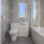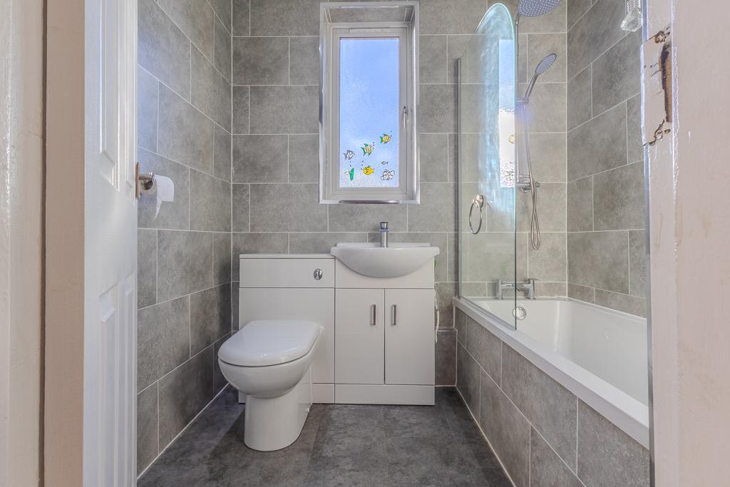 To the rear, the fully fitted kitchen offers a range of modern wall and base units, complemented by ample worktop space and direct access to the garden. Completing the ground floor is a family bathroom fitted with a contemporary three-piece suite, including a shower over the bath.
