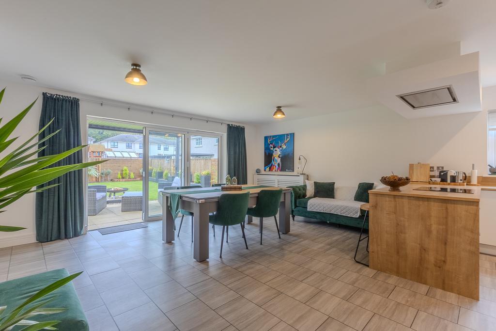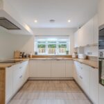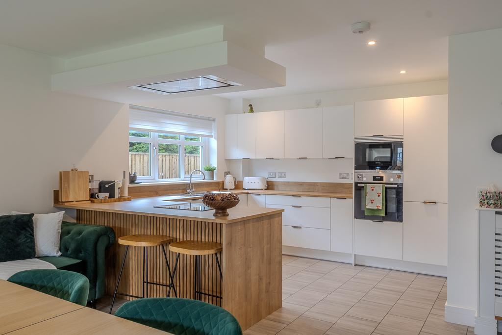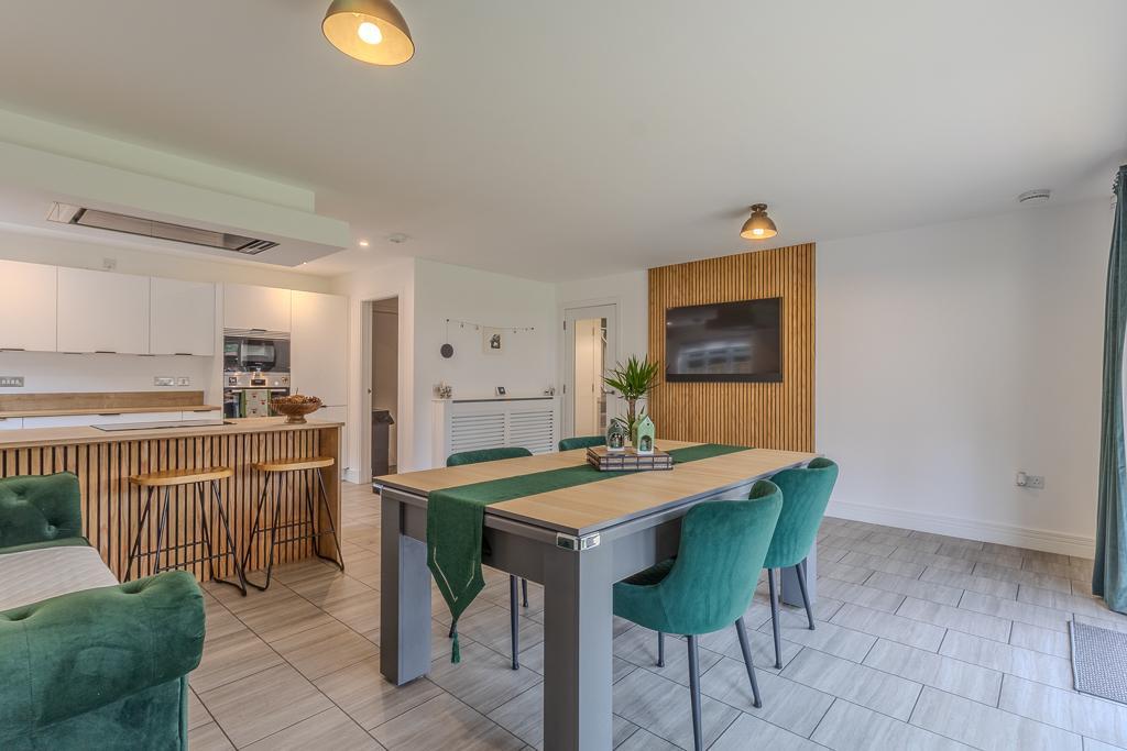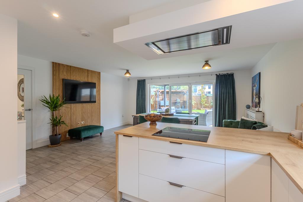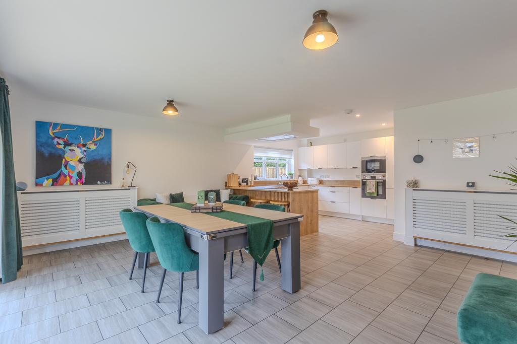 At the heart of the home is a magnificent open-plan kitchen, dining, and family area, designed for modern living and entertaining. The kitchen is fitted with sleek contemporary units, integrated appliances, and ample space for dining and socialising, while large windows flood the space with natural light. From here, French doors lead effortlessly to the garden terrace, ideal for summer gatherings.