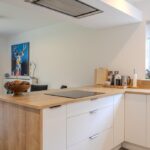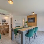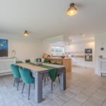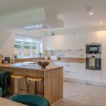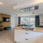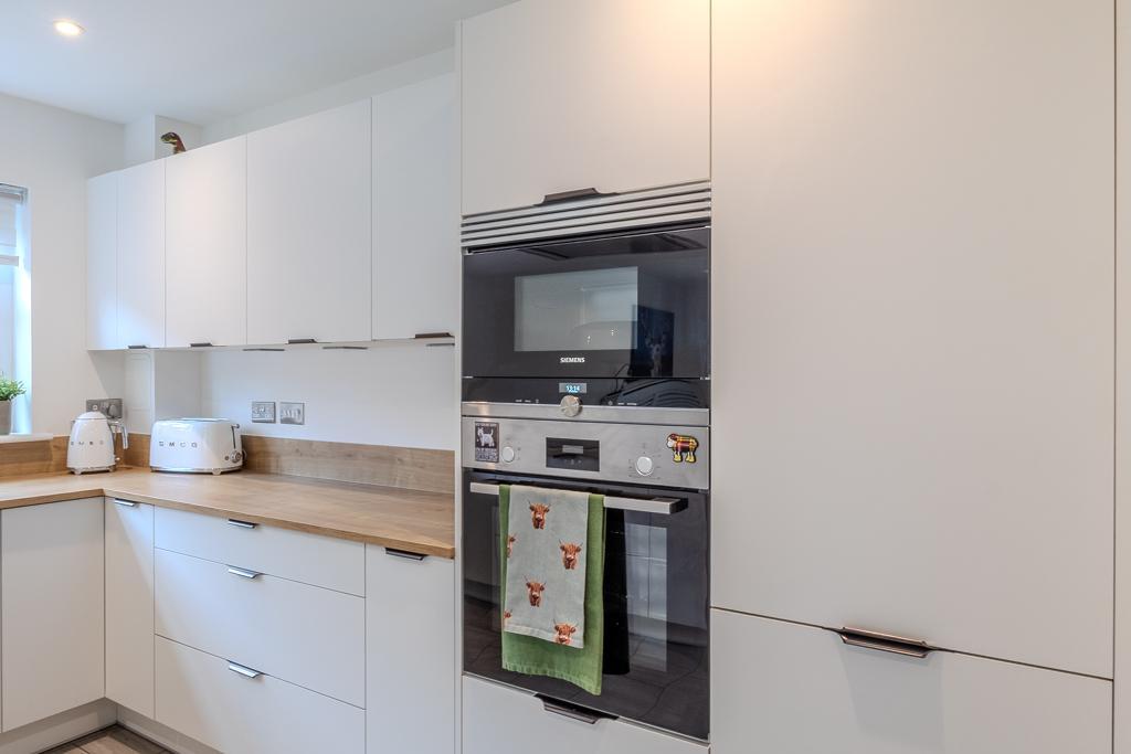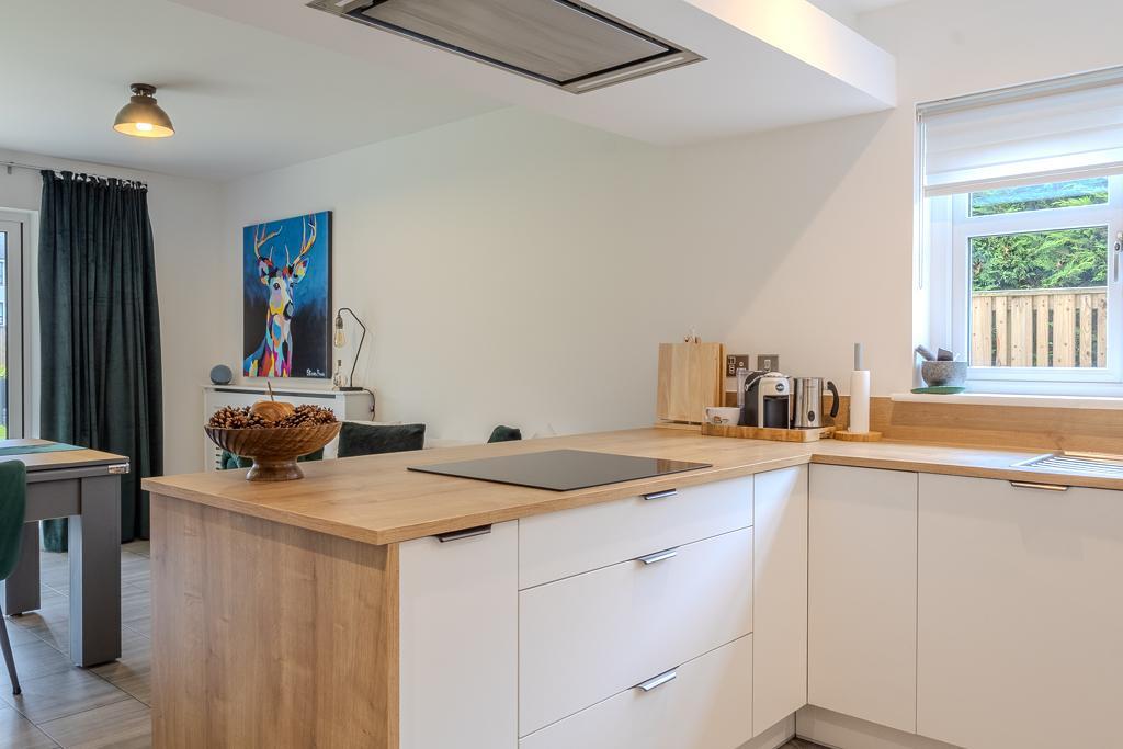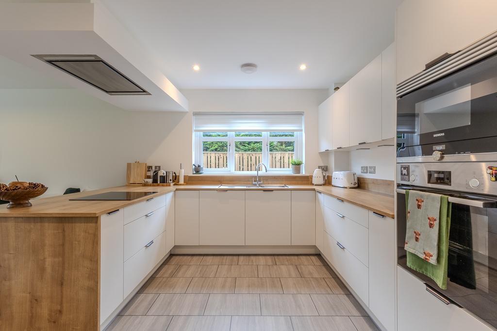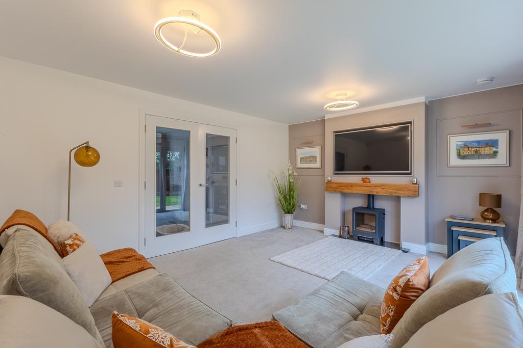 At the heart of the home is a magnificent open-plan kitchen, dining, and family area, designed for modern living and entertaining. The kitchen is fitted with sleek contemporary units, integrated appliances, and ample space for dining and socialising, while large windows flood the space with natural light. From here, French doors lead effortlessly to the garden terrace, ideal for summer gatherings.