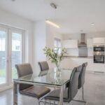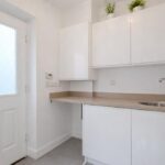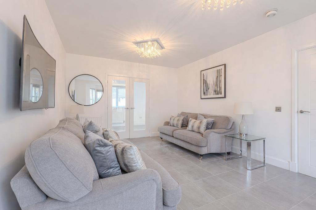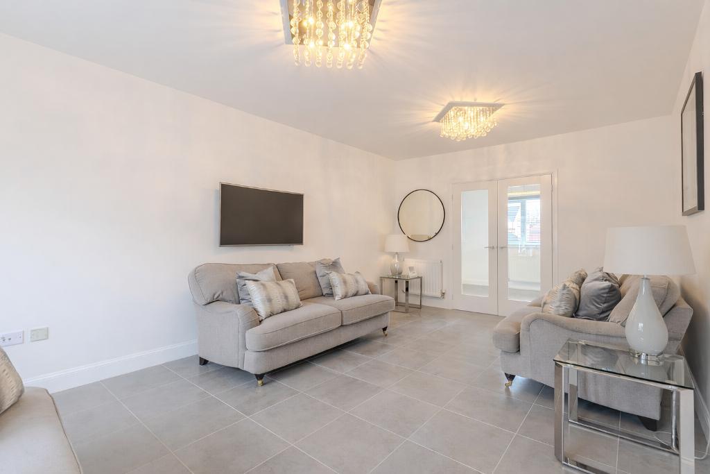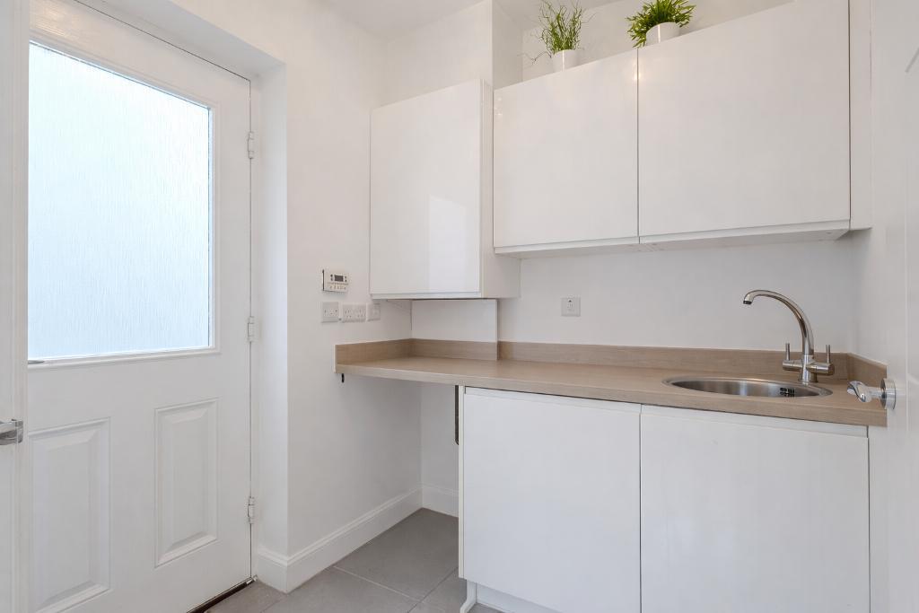 To the rear lies the heart of the home: a stunning open-plan kitchen, dining and family area designed for modern living. This impressive space is flooded with natural light and features French doors opening directly onto the rear garden, creating an ideal environment for both everyday family life and entertaining. The kitchen offers an excellent range of contemporary units and workspace and is complemented by a separate utility room providing additional practicality.