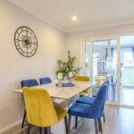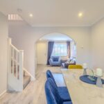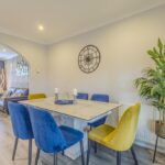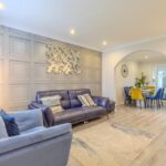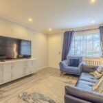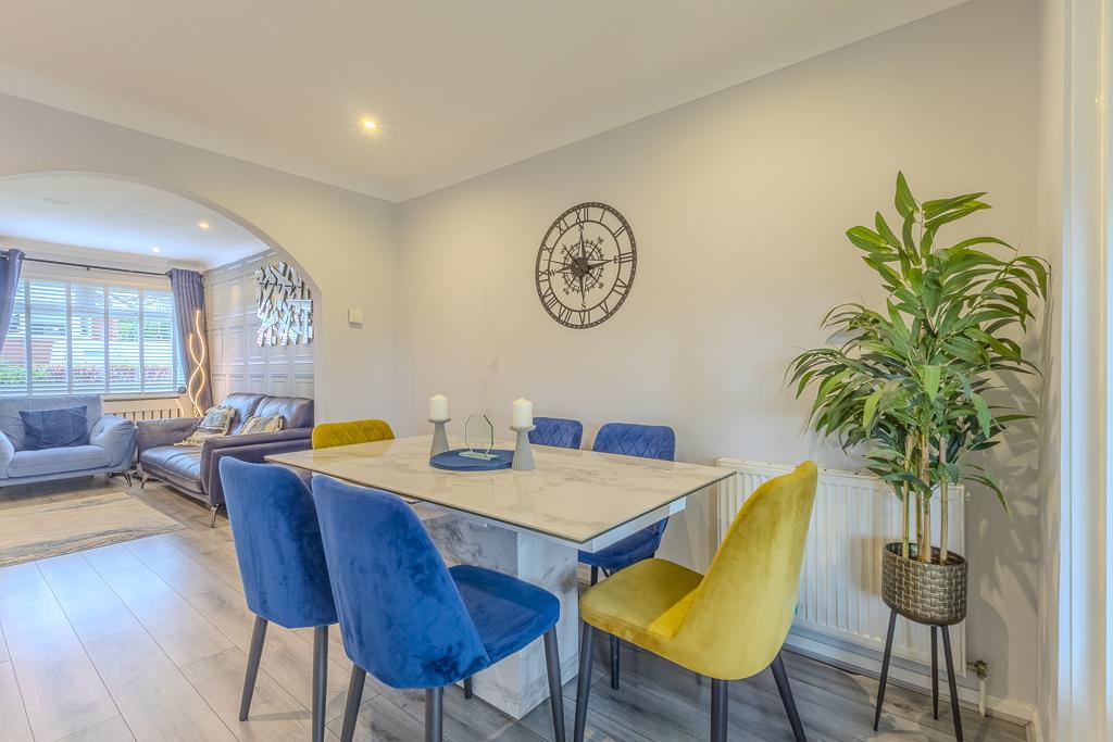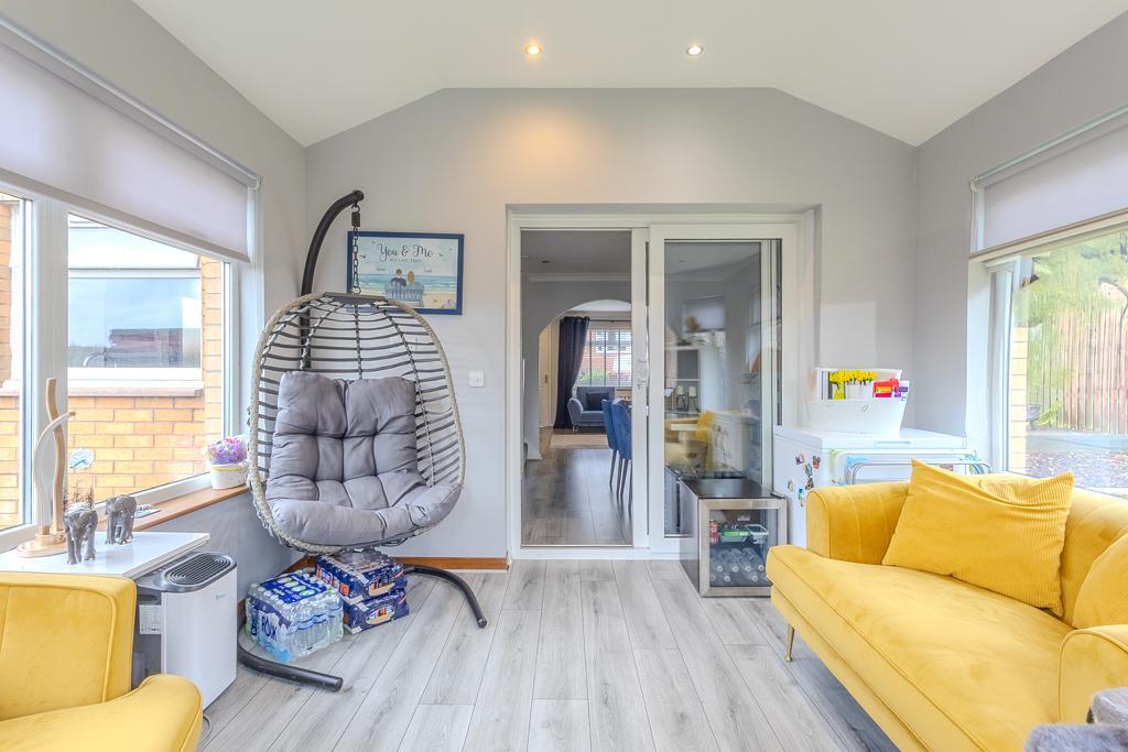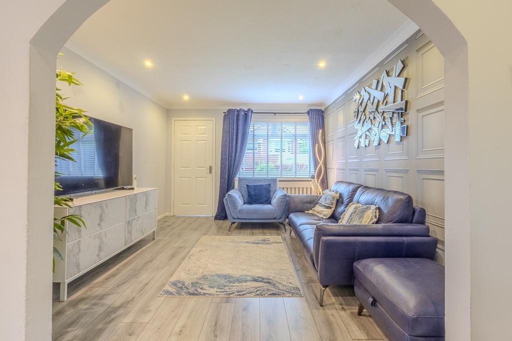 A bright and welcoming entrance vestibule provides an inviting introduction to the home and opens into a spacious lounge and dining area. This elegant open-plan living space is flooded with natural light from the front-facing bay window and offers an ideal setting for family gatherings or entertaining. From here, double doors lead into the bright garden room, complete with patio doors that open onto the private rear garden, seamlessly connecting indoor and outdoor living.