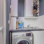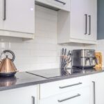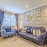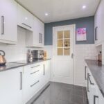 The contemporary fitted kitchen is finished to an excellent standard, featuring sleek white high-gloss cabinetry, contrasting black work surfaces, and feature brick-effect tiling. It includes a full range of integrated appliances: electric hob, oven, microwave, dishwasher, fridge-freezer, and washing machine, all included in the sale. A practical utility room, located off the kitchen, provides additional storage and direct access to both the rear garden and driveway.