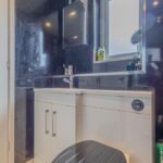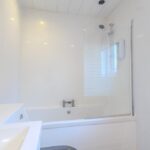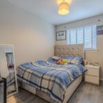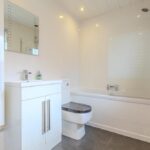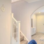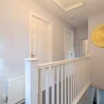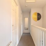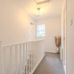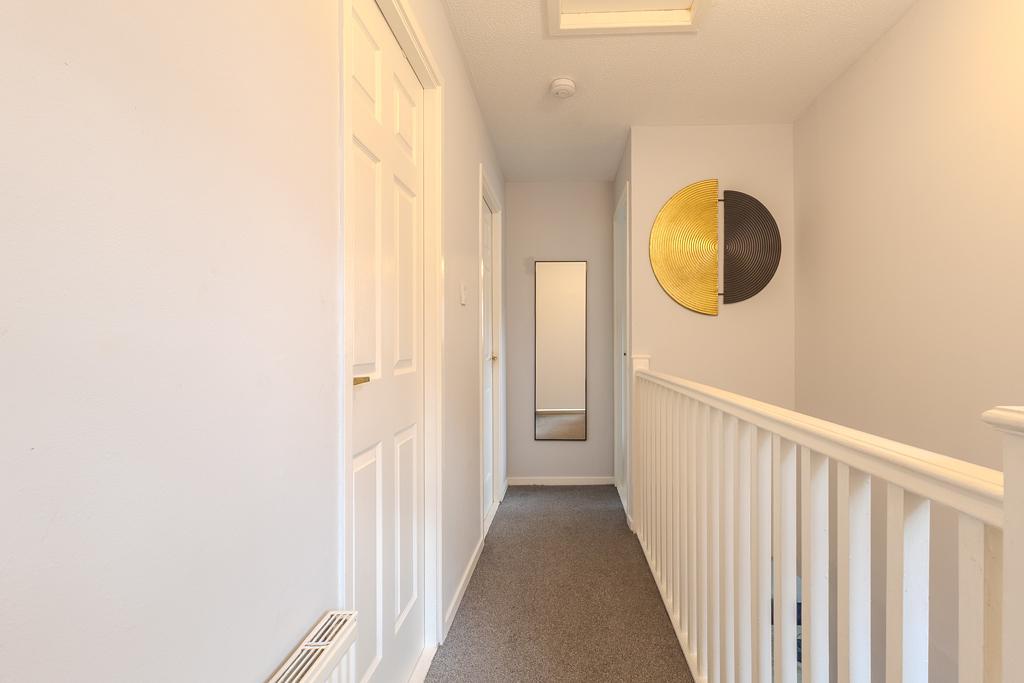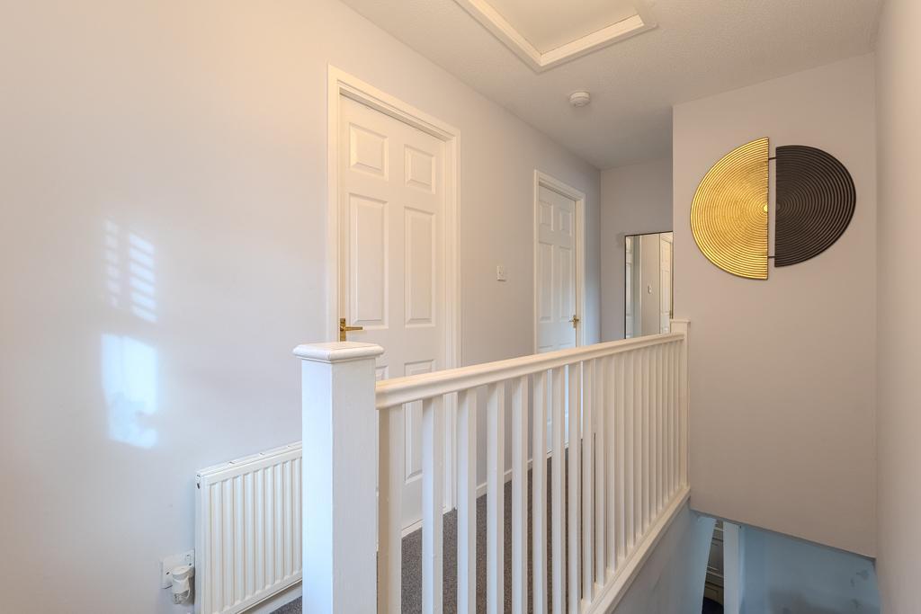 Upstairs, the light and airy landing leads to three well-proportioned bedrooms, all benefiting from fitted wardrobes. The principal bedroom enjoys a sleek en suite shower room complete with rainfall shower, vanity storage, and chrome fittings. The beautifully appointed family bathroom completes the upper level, featuring a bath with overhead shower, modern vanity unit, and elegant finishing touches.