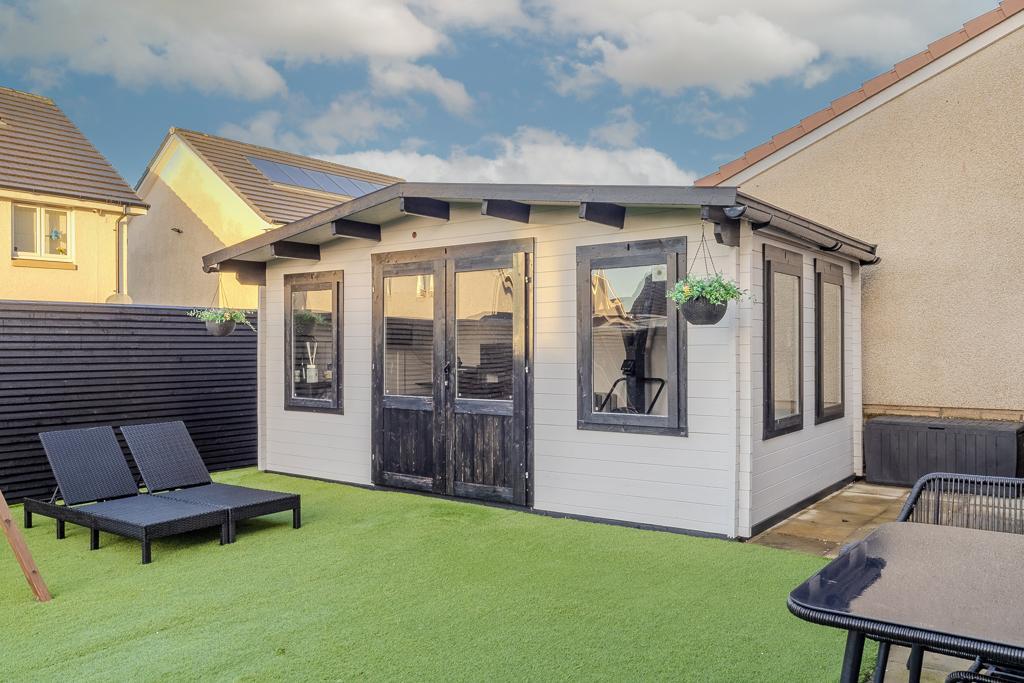 Externally, the rear garden has been thoughtfully landscaped to offer an exceptional outdoor space, featuring a lovely powered summerhouse currently utilised as a home gym/office, along with a neatly maintained lawn and patio areas ideal for family enjoyment and entertaining. To the front, a wide monoblock driveway provides ample parking.