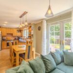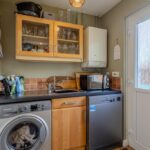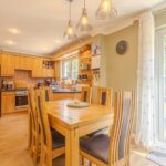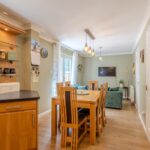 The contemporary kitchen is appointed with sleek cabinetry, integrated appliances, and ample space for both dining and informal seating. Off the kitchen is a practical separate utility room, providing further storage and laundry space, with a convenient WC positioned adjacent.