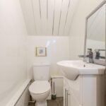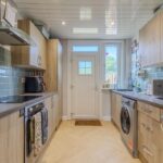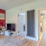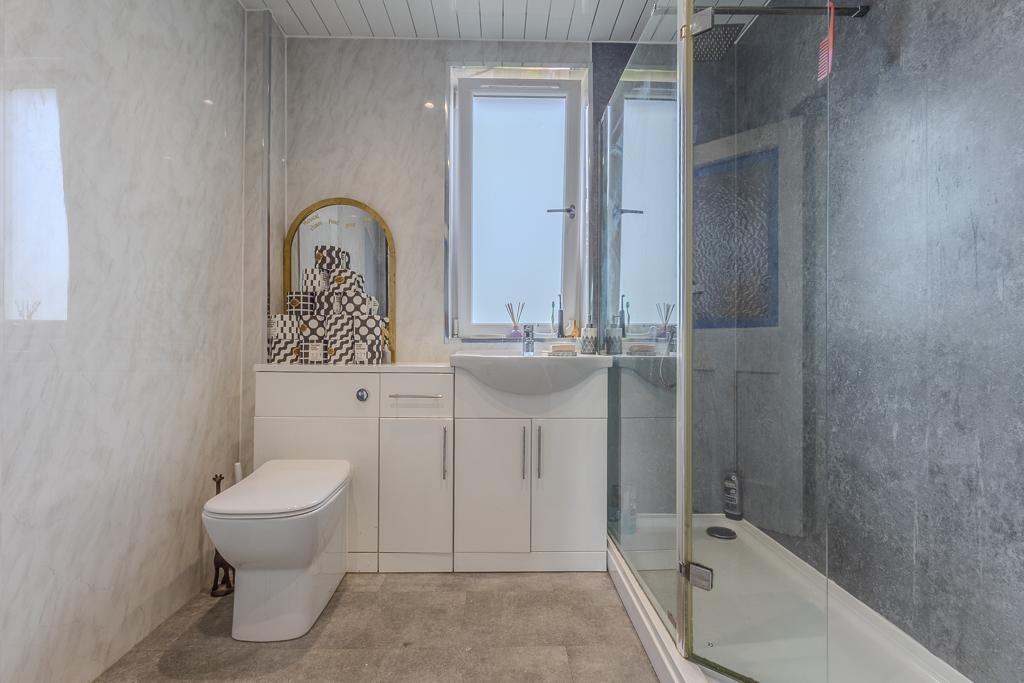 Upstairs, there are two well-proportioned bedrooms, with the principal bedroom benefitting from fitted storage. A beautifully appointed family shower room serves the upper level, featuring contemporary finishes.