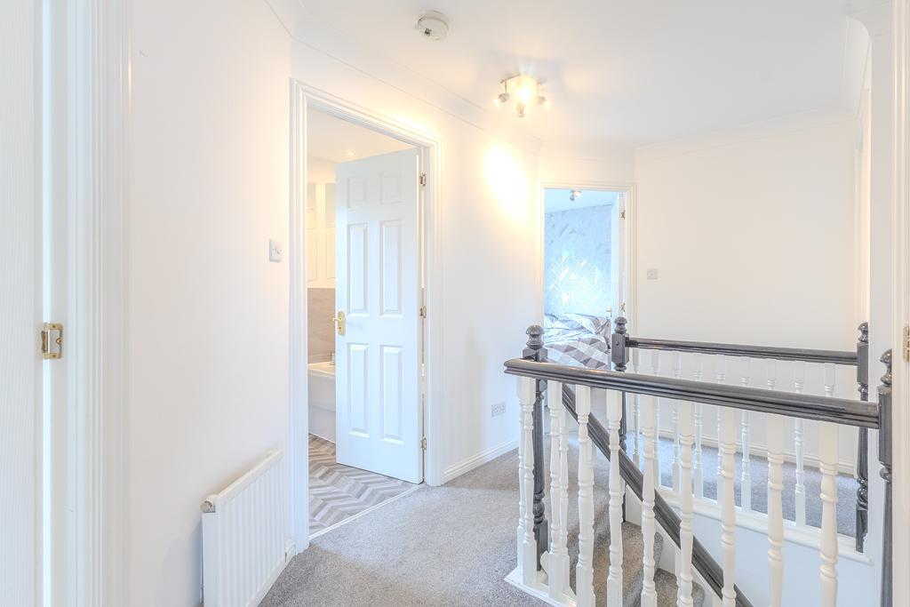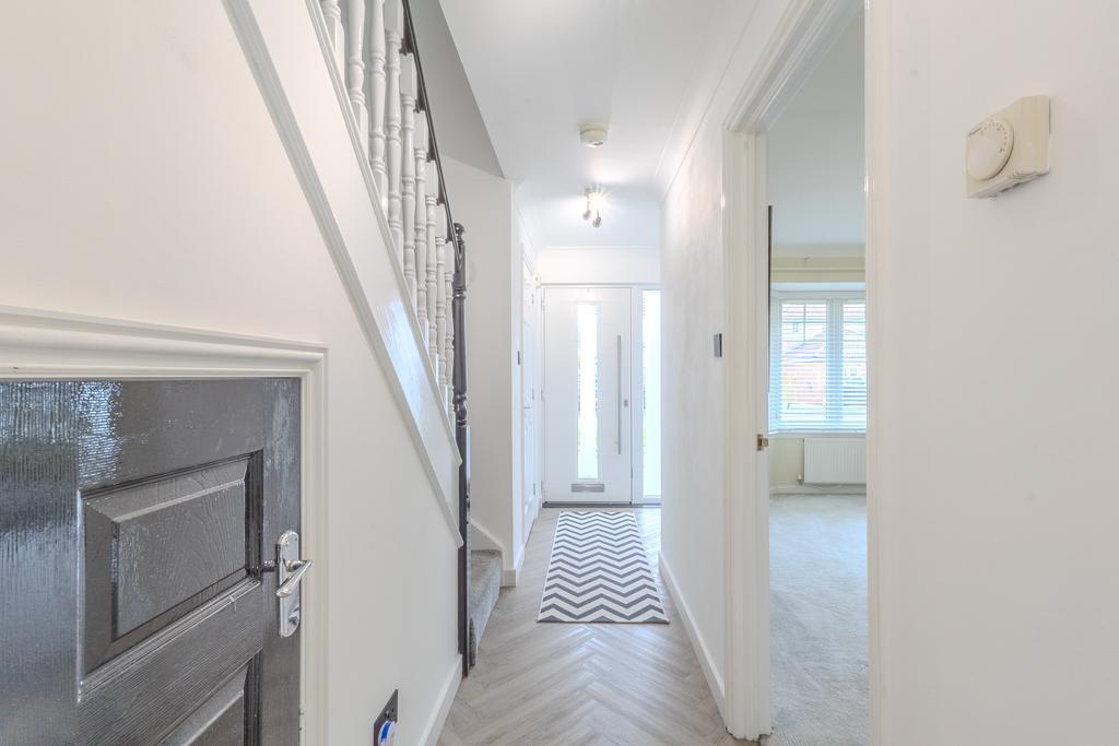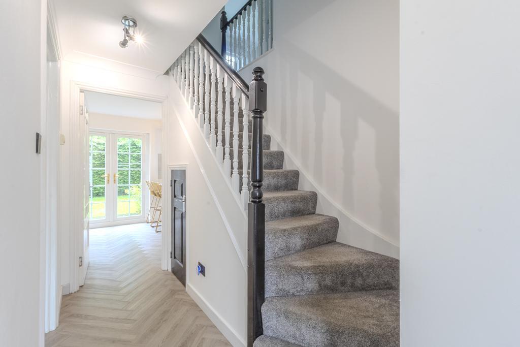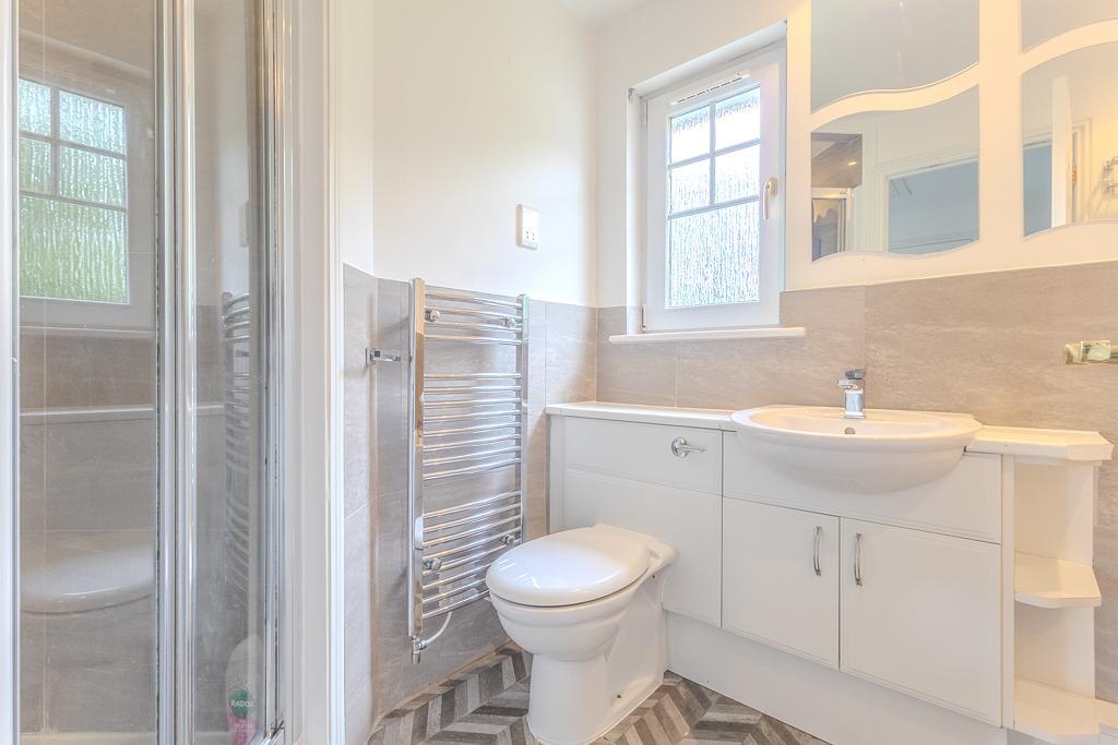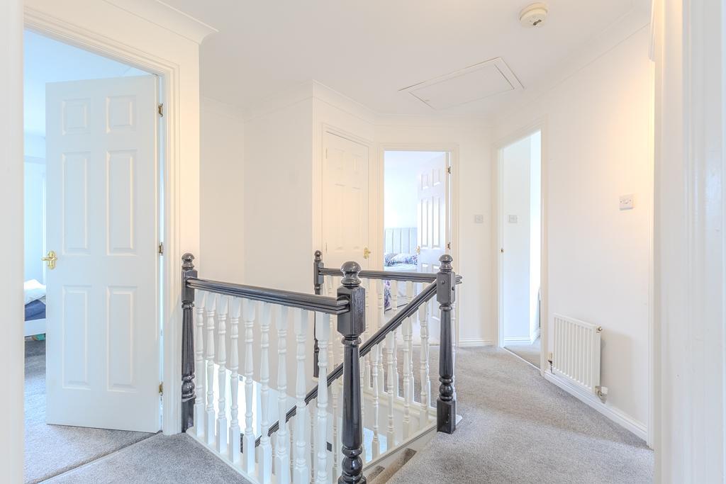 On the upper level, there are four generously sized bedrooms, all benefitting from fitted wardrobes. The principal bedroom features its own en suite shower room, while a stylish main family bathroom serves the remaining bedrooms.